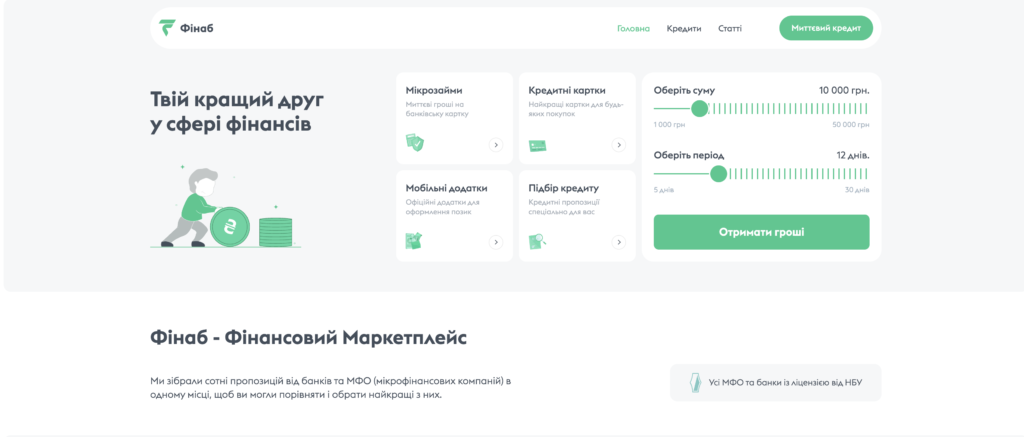 Отже, що таке Фінаб? Це фінансовий маркетплейс, який об’єднує пропозиції від різних банків та мікрофінансових організацій (МФО) України, надаючи користувачам можливість порівнювати та обирати найкращі кредитні та банківські продукти. Сервіс пропонує інформацію про мікрозайми, кредитні картки та інші фінансові послуги, допомагаючи користувачам швидко знаходити та оформлювати позики онлайн.
