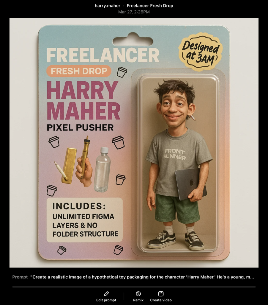 Можна черпати натхнення прямо в тулзі. Тренд із 3д ляльками в коробці, який розлетівся по соцмережам, вперше ми побачили саме в цій бібліотеці – він зароджувався у нас на очах. Архів із роботами інших користувачів, разом із промптами, які ви можете ремікснути під себе.
