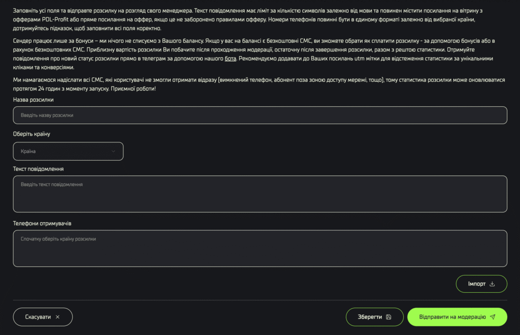 Для швидкої та ефективної роботи з вашою базою номерів використовуйте інструмент SMS Sender всередині партнерки PDL-Profit. Це дуже зручно, вам не треба реєструватися в додаткових сервісах, проходити онбординги, тощо. Отже, як запустити розсилку:
