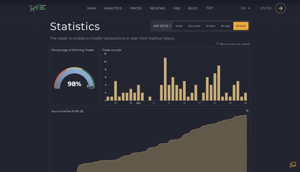 Ми ведемо публічний щоденник трейдера, де відображаються всі результати роботи нашого алгоритму в реальному часі. Це означає, що кожен може легко перевірити наші результати та переконатися в ефективності стратегії. Щоденник розміщений на авторитетній платформі TraderMake.Money, якій довіряють тисячі трейдерів з усього світу.