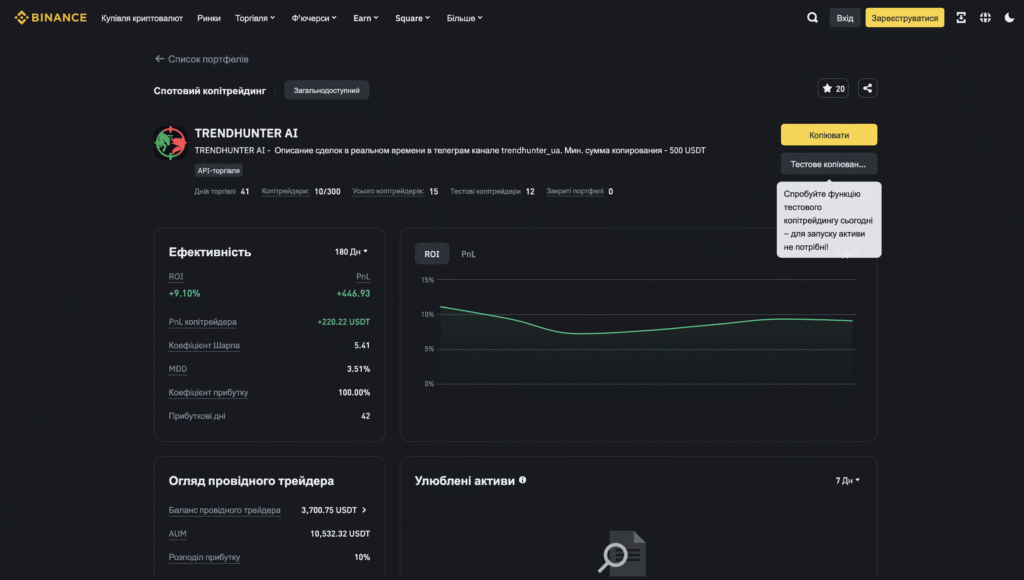 TrendHunter AI — це українська розробка, бот для автоматичної спотової торгівлі через Binance Copy Trading. Під капотом боту ШІ алгоритм, який вже показує понад 120% річних!